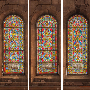 Die Figuren, die mit allen Einzelheiten genau gezeichnet sind, thronen bis auf Christus vor zwei exzentrischen Kreisen. Der innere ist rot, der äußere blau gefärbt. Beide sind durch ein weißes Band voneinander abgesetzt. Jedes Rundglas ist mit einem gelben Perlband eingefasst.