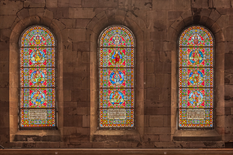 mehr anzeigenIn den drei Rundbogenfenster befinden sich jeweils drei spätromanische, weitgehend originale Medaillons, die Figuren aus dem Stammbaum Jesu zeigen. Ursprünglich befanden sich diese im Mittelfenster des spätromanischen Chors. Schon beim Anbau des Umgangschores müssen sie ihren ursprünglichen Platz verloren haben. 1918 wurden sie von Fritz Geiges restauriert und ins Querhaus versetzt.Die Rundfenster im mittleren Fenster zeigen Christus, Maria als Himmelskönigin und König Salomon. Im linken Fenster werden Moses mit der ehernen Schlange, Isaak mit dem Reisigbündel der versuchten Opferung und Jakob mit der Himmelsleiter dargestellt. Rechts ist der Prophet Elija mit den gekreuzten Hölzern der Witwe von Sarepta, König Joram und König Roboam zu sehen.
