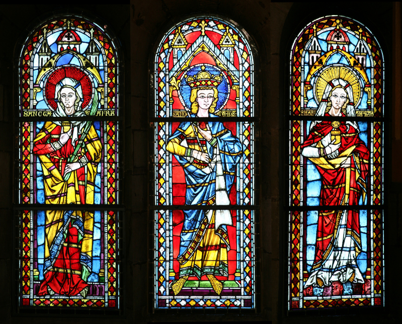 Die drei lebensgroßen Figuren stehen als Sinnbild für das Jüngste Gericht. Die hl. Afra und die hl. Maria Magdalena, die als bekehrende Sünderinnen bekannt sind, tragen jeweils unter ihrem Mantel ein enganliegendes Gewand mit einem Gürtel und ein Kopftuch, das bei Afra mit einem blauen und bei Maria Magdalena mit einem roten Band verziert ist, Beide halten ein Salbgefäß in der rechten ... mehr anzeigenDie drei lebensgroßen Figuren stehen als Sinnbild für das Jüngste Gericht. Die hl. Afra und die hl. Maria Magdalena, die als bekehrende Sünderinnen bekannt sind, tragen jeweils unter ihrem Mantel ein enganliegendes Gewand mit einem Gürtel und ein Kopftuch, das bei Afra mit einem blauen und bei Maria Magdalena mit einem roten Band verziert ist, Beide halten ein Salbgefäß in der rechten Hand. Die Palme in Afras linker Hand steht als Zeichen für ihren Märtyrertod.