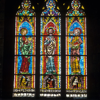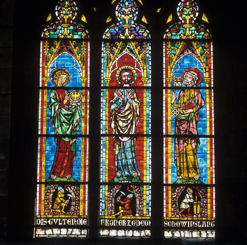 Das mittelalterliche Fenster ist zwischen 1330 und 1340 entstanden. Es handelt sich um ein dreibahniges Maßwerkfenster mit gespitzten, radial ausgerichteten Vierpässen in Bogenquadraten. Wie die Inschrift besagt, handelt es sich um eine Stiftung der froner ze dem schowinslant.