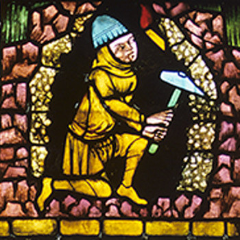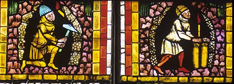 Das zentrale Motiv stellt hier die Verklärung Christi dar. Da sich das Fenster in mehr als 20 Meter Höhe befindet, wird das Sujet durch vergröberte und vereinfachte Formen dargestellt. In den Evangelien wird beschrieben, wie Jesus mit Petrus, Jakobus und Johannes auf den Berg Tabor steigt und sich im Beisein von Mose und Elija verwandelt. Bei Matthäus wird diese Szene wie folgt ... mehr anzeigenDas zentrale Motiv stellt hier die Verklärung Christi dar. Da sich das Fenster in mehr als 20 Meter Höhe befindet, wird das Sujet durch vergröberte und vereinfachte Formen dargestellt. In den Evangelien wird beschrieben, wie Jesus mit Petrus, Jakobus und Johannes auf den Berg Tabor steigt und sich im Beisein von Mose und Elija verwandelt. Bei Matthäus wird diese Szene wie folgt beschrieben: „Und er ward verklärt vor ihnen, und sein Angesicht leuchtete wie die Sonne, und seine Kleider wurden weiß wie ein Licht“ (Mt 9,2). Das Medium Licht bekommt hier eine besondere Bedeutung, da es für die Göttlichkeit Christi steht. Dies geschieht auf der Bildebene durch die helle Haut und Kleidung Christi sowie seinen blau leuchtenden Nimbus. Gleichzeitig fällt durch das farbige Glas Sonnenlicht, wodurch das Leuchten zu einer realen Dimension im Kirchenraum wird. Dadurch kann die Verklärung Christi für die Kirchenbesucher nachempfunden werden. Im Sockelfenster befindet sich eine weitere Art des Lichts in Form von kleinen Kerzen. Welche Bedeutung hat dieses Licht wohl für die Bergarbeiter in dem sonst düsteren Stollen? weniger anzeigen
