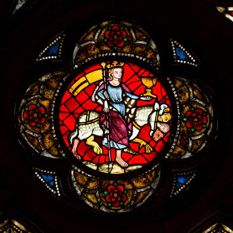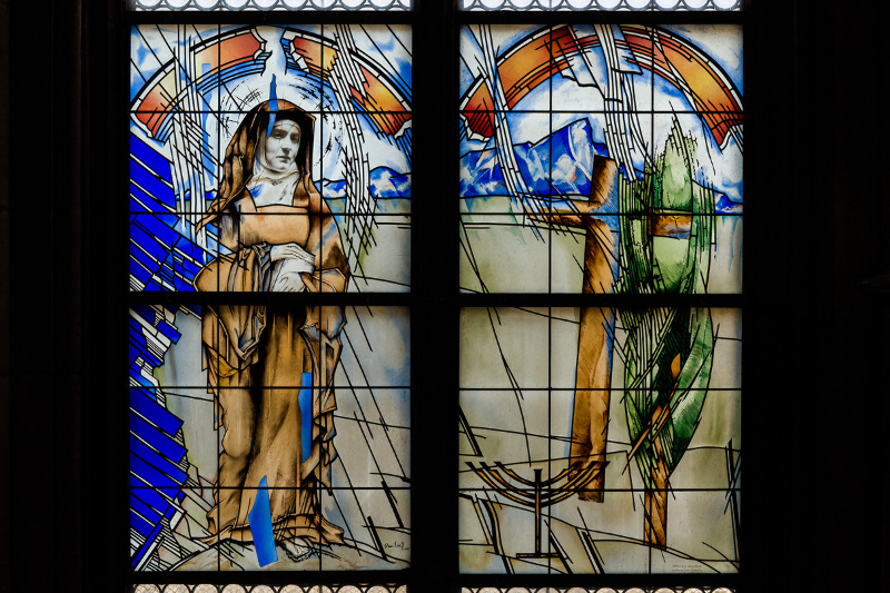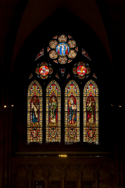 Die vier Schutzpatrone der Tucher in den großen vier Fenstern sind die Apostel Paulus und Jakobus der Jüngere, in der Mitte Bischof Severus von Ravenna und der Eremit Antonius.Im Bildprogramm kehrt das Thema von Ecclesia und Synagoge in aggressiver Gestalt wieder. Ecclesia reitet zum Duell gegen die Synagoge. Die Synagoge scheint hier stellvertretend für die Juden besiegt zu werden, bei denen die Grafen von Freiburg hoch verschuldet waren. Die Darstellung geht einem grausamen Progrom im Januar 1349 voraus, bei dem alle erwachsenen Juden der Stadt Freiburg verbrannt und die Kinder zur Taufe gezwungen wurden.