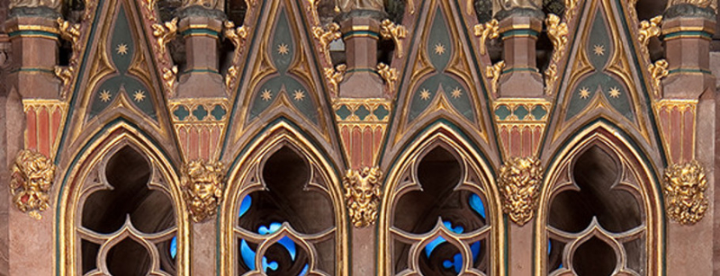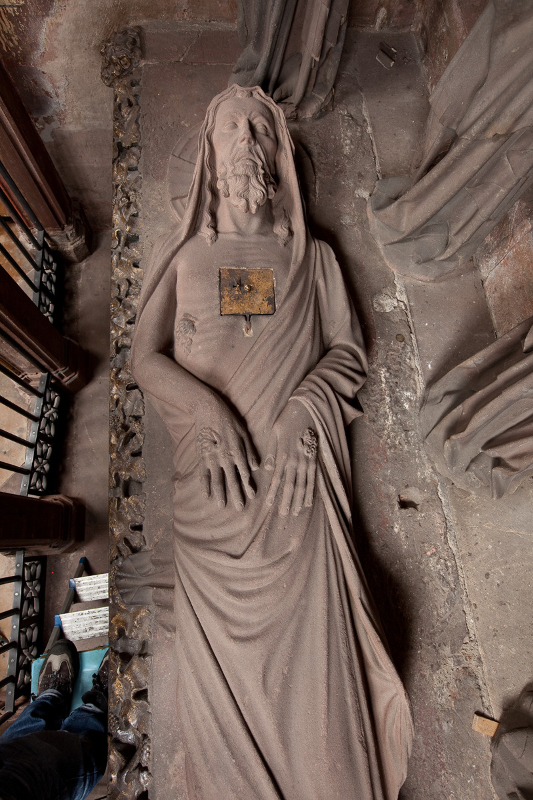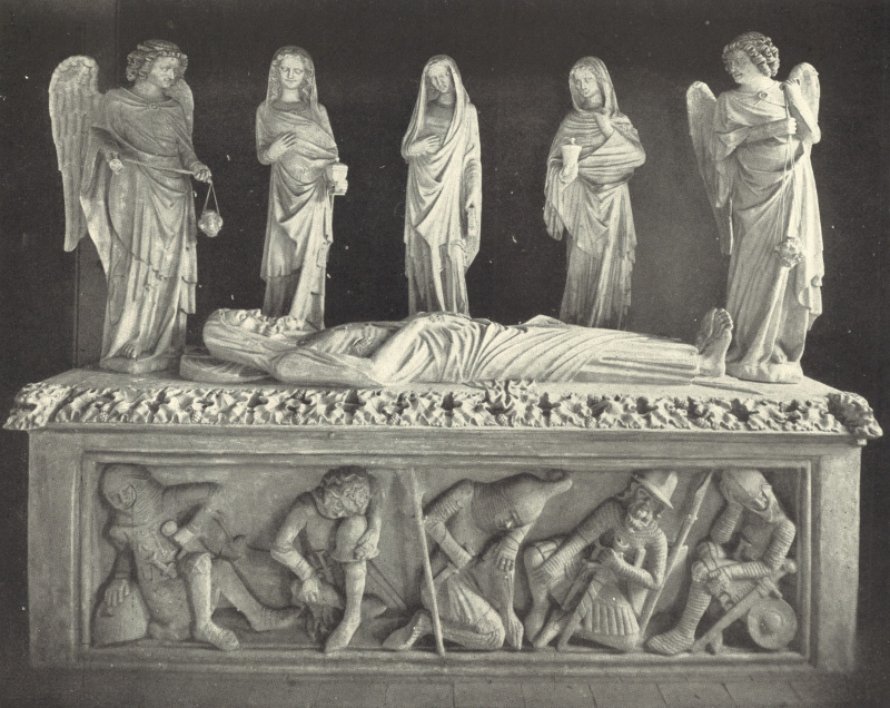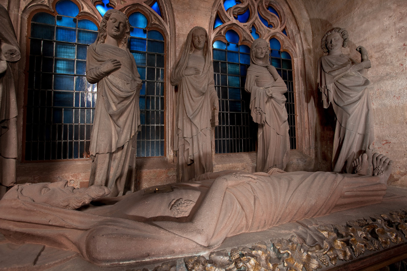 Die gotische Heiliggrabkapelle befindet sich in einer Wandnische im südlichen Seitenschiff. Innerhalb der reich geschmückten, spitzgiebeligen Architektur ruht der überlebensgroß dargestellte Leichnam Christi. Hinter ihm stehen drei Frauen, zwei mit Salbungsgefäßen, die Mittlere mit Buch, flankiert von zwei Engeln mit Weihrauchfässern. Als Hochrelief auf der Tumba ausgeführt, ruhen ... mehr anzeigenDie gotische Heiliggrabkapelle befindet sich in einer Wandnische im südlichen Seitenschiff. Innerhalb der reich geschmückten, spitzgiebeligen Architektur ruht der überlebensgroß dargestellte Leichnam Christi. Hinter ihm stehen drei Frauen, zwei mit Salbungsgefäßen, die Mittlere mit Buch, flankiert von zwei Engeln mit Weihrauchfässern. Als Hochrelief auf der Tumba ausgeführt, ruhen unterhalb der Jesusfigur fünf bewaffnete Soldaten.Die Figurengruppe birgt eine räumliche, zeitliche, sowie emotionale Überblendung verschiedener Elemente der Ostererzählung. Der Körper des toten Christus ist von detaillierten Spuren seines Leidens gezeichnet. Er wird von schlafenden Soldaten bewacht. Damit sind Momente der biblischen Ostergeschichte aufgerufen, an die am Karsamstag erinnert wird. Der Besuch der Frauen am Grab, der mit der Freude über die Auferstehung des Heilands verbunden ist, gehört dagegen den Erzählungen des Ostersonntags an. Die Anwesenheit des Leichnams Christi ist in diesem Kontext unlogisch, da die Frauen der biblischen Geschichte das Grab leer vorfinden.