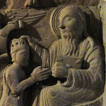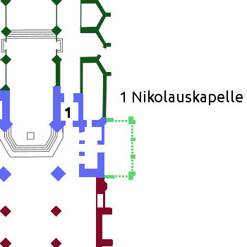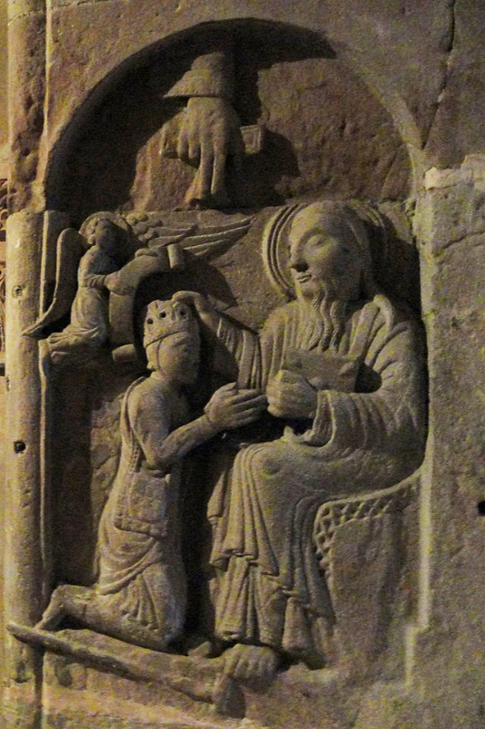 In der ehemaligen Nikolauskapelle befindet sich ein weiteres rundbogiges Relief, das vier Akteure in einer Szene der Segnung verbindet: einen bärtigen Heiligen auf dem Thron, einen jugendlichen Herrscher mit Pilgertasche, einen Engel mit Spruchband und die Dextera Dei, die von oben in das Bogenfeld hineintragt und eine geschlossene Schriftrolle hält. Ikonographisch ist leider nicht klar, welcher Herrscher hier von welchem Heiligen gekrönt wird.