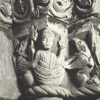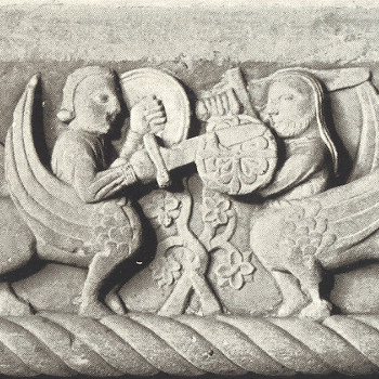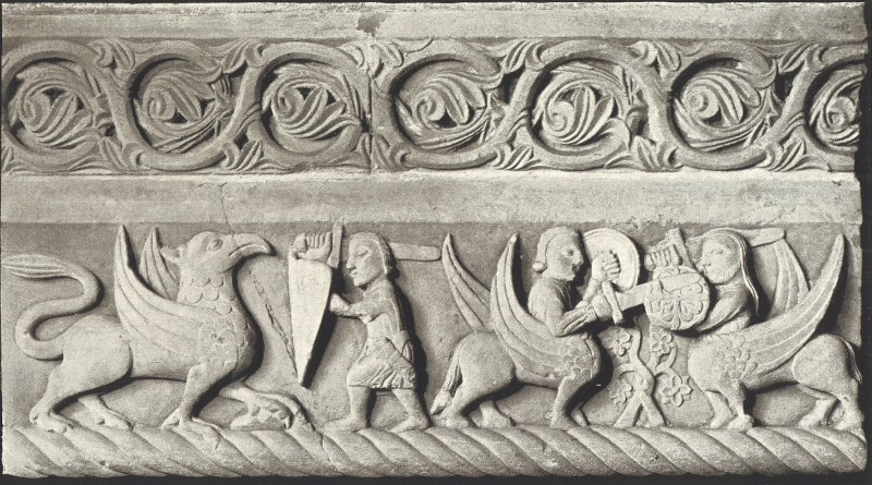 Auf der linken Seite zeigt der Fries zwei klar von einander getrennte Szenen. Ein Mann kämpft mit einem Greifen, rechts davon sieht man eine Kampfszene mit zwei Kentauren (Mischwesen aus Pferd und Mensch). Der jüngere Kämpfer links durchstößt das Schild des bärtigen Kämpfers mit langen Haaren. Auf den links anschließenden Eck-Kapitellen ist eine Sirenenfamilie zu sehen. Die Mutter stillt ihr Kind, das einen Vogel bei den Füßen gepackt hält.
