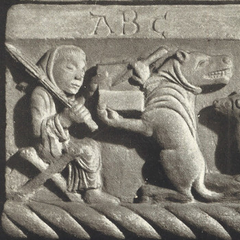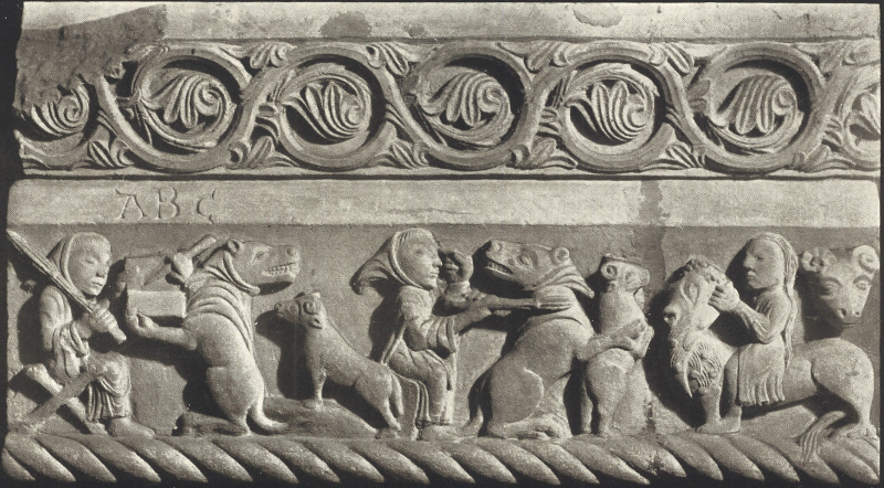 Der Fries auf der rechten Seite zeigt drei Szenen, die von links nach rechts gelesen werden. Ein in eine Kutte gezwängter Wolf wird von einem Mönch unterrichtet, was das eingemeißelte ABC darüber verdeutlicht. Allerdings richtet der Wolf seine Aufmerksamkeit auf ein Lamm. Auch die Züchtigung des Lehrers kann ihn nicht davon abhalten, das Lamm zu reißen. Die Wolfsschule wird oft als Warnung vor den Gefahren ungezügelter Triebe interpretiert. Die dritte Szene zeigt einen Kampf mit einem Löwen und – recht unzusammenhängend – einen Widderkopf.