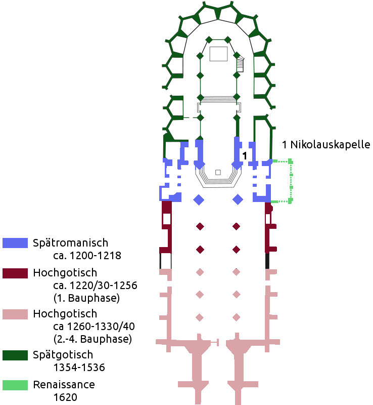 Der Grundriss mit eingetragenen Bauphasen verdeutlicht, wie aus den seitlichen Apsiden der romanischen Kirche Durchgangsräume zum spätgotischen Chorumgang wurden.