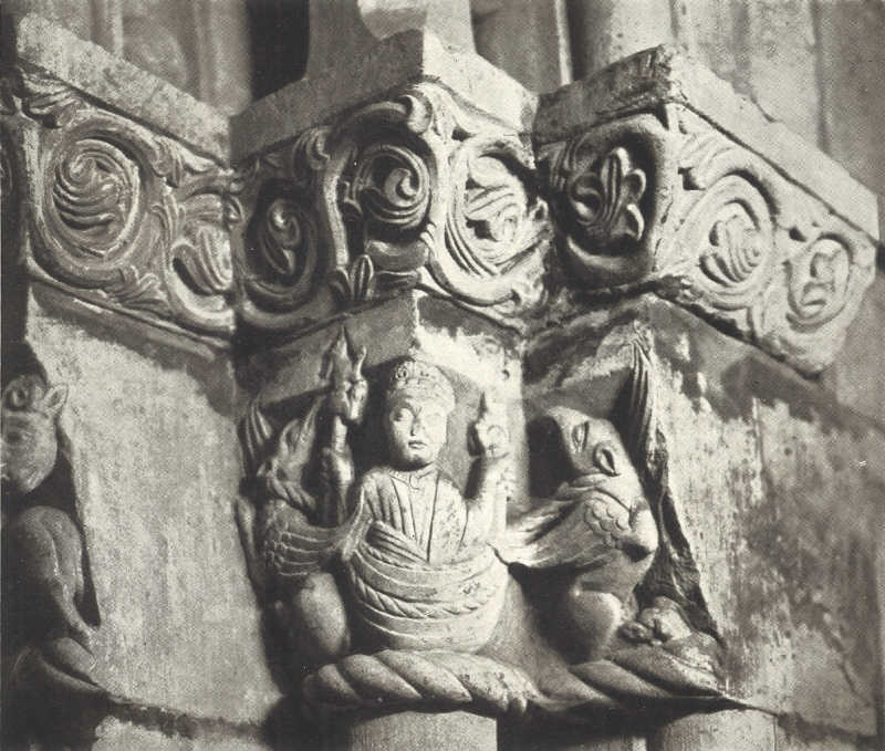 Das rechte Eck-Kapitell zeigt die Greifenfahrt Alexanders des Großen. Zwei Greifen tragen den König Makedoniens in einem Korb durch die Luft, während dieser sie mit Hasen auf langen Stäben dazu bringt, höher zu fliegen. Die Szene thematisiert die Grenze zwischen Hochmut und Fall fügt sich so in die Reihe eher lasterhafter Szenen, die an der Schwelle zum sakralen Raum den Übertritt ins Reine und Heilige markieren.